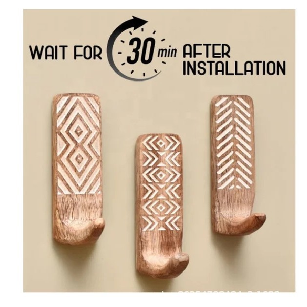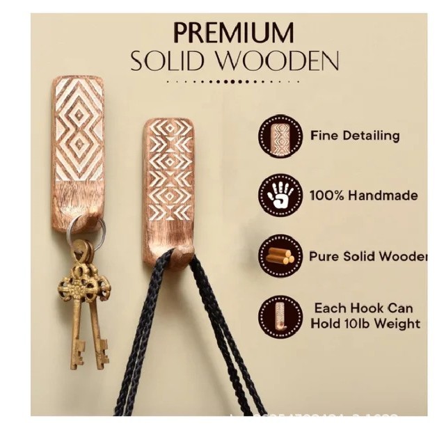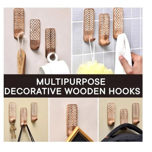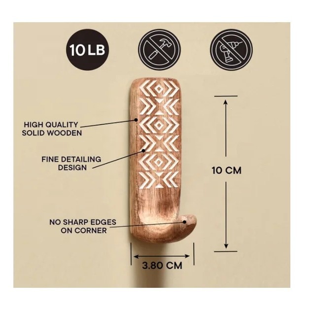 Bring refined simplicity to your space with this set of 3 handcrafted wooden wall hooks. Each hook is carved from quality natural wood and features a unique geometric engraving in soft white tones. Inspired by Nordic minimal luxury, these hooks are not only functional for coats, scarves, bags, or towels but also serve as charming decorative accents. Their sturdy build ensures durability, while the organic texture complements Japandi, Scandinavian, or bohemian interiors
